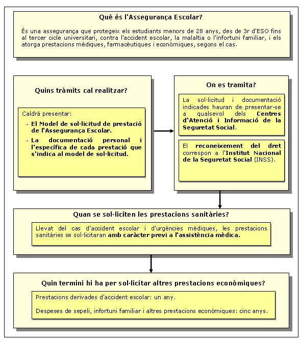 És una Assegurança que protegeix els estudiants, menors de 28 anys, que cursin estudis oficials des de 3r d’ Educació Secundària Obligatòria (ESO) fins al final del 3r cicle universitari, mitjançant prestacions sanitàries i econòmiques, en cas de malaltia , accident escolar i infortuni familiar. |