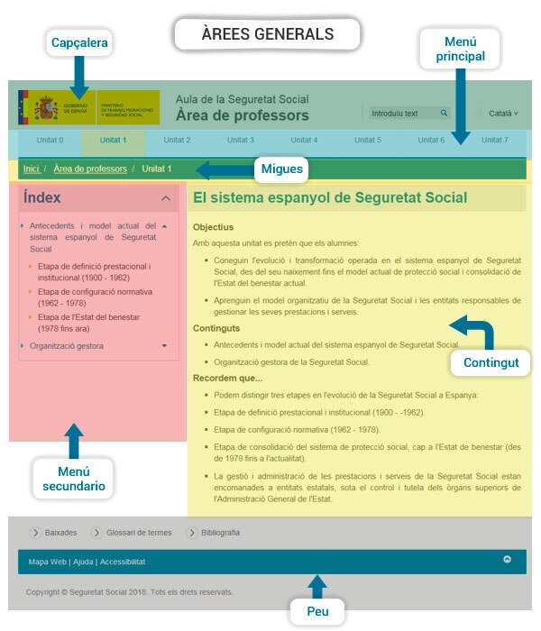 Així, l'àrea de professors de l'Aula de la Seguretat Social es divideix en les següents zones com es pot veure en l'esquema més avall: