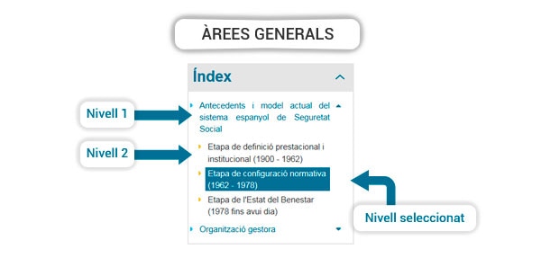 Després de polsar qualsevol opció del menú, es mostra en l'àrea esquerra el seu arbre de contingut, cosa que permet la navegació a fons. En esta secció s'ha establert un codi de colors en verd (com totes les àrees navegables i "interactuables" del portal), partint del verd més fort com primer nivell del menú secundari, fins un verd més clar en el tercer i últim nivell de navegació.