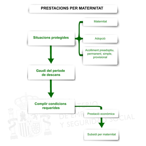 Per a la prestació per maternitat, es consideren situacions protegides la maternitat, l'adopció i l'acolliment tant preadoptiu com permanent o simple, de conformitat amb el Codi Civil o les lleis civils de les comunitats autònomes que ho regulen, sempre que, en aquest últim cas, la durada no sigui inferior a un any i encara que aquests acolliments siguin provisionals, durant els períodes de descans que per aquestes situacions gaudeixen legalment els treballadors.
