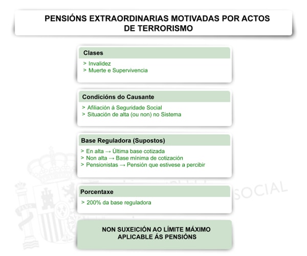 As persoas que resulten incapacitadas ou os familiares de quen faleza como consecuencia de actos de terrorismo, terán dereito, respectivamente, a pensións extraordinarias de invalidez, ou de morte e supervivencia.